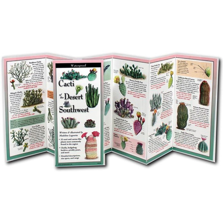 Instant access to just what curious beginners need to know about the most common cacti of the four main deserts of the American southwest: Sonoran, Chihuahuan, Mojave, and Great Basin, as well as prairies, woodlands, and high mountain habitats of the region. Written and illustrated by Madeline Logowitz, naturalist, biological researcher, outdoor guide, and “Artist in the Park” for Arches and Canyonlands National Parks. 33 species are covered: chollas, hedgehogs, prickly pears, fishhook. Each entry includes descriptive caption, size, range, and multiple illustrations. Sidebar information on pollination, anatomy, spine structure and growth forms. Handy fold-out format: 6 panels each 4? X 9?. Perfect for backpack, glove compartment, or kitchen table. Indestructible waterproof lamination.